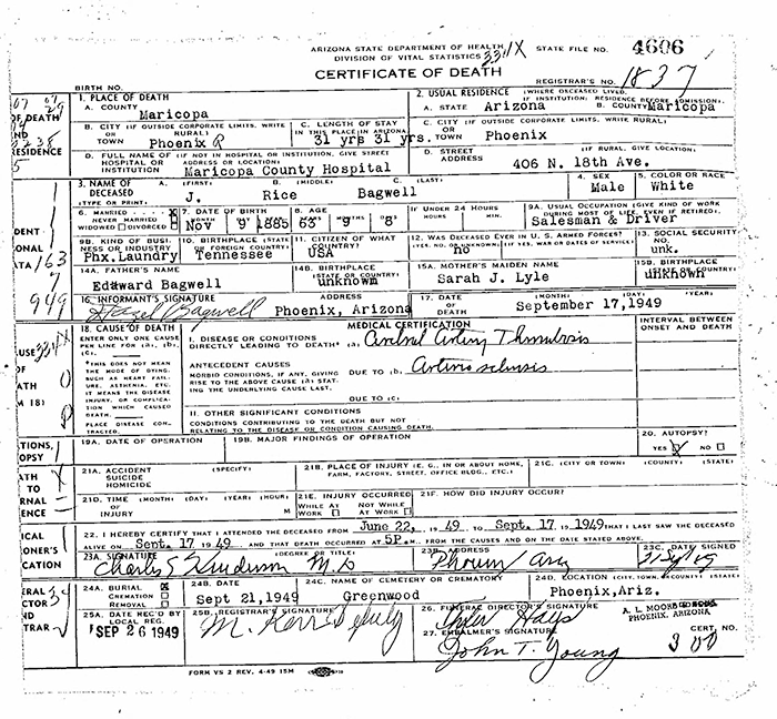 J. Rice Bagwell was born on 9 November 1885 in Montgomery County, Tennessee.1 He was the son of Edward Bentley Bagwell and Sarah Jane Lyle. J. Rice Bagwell married Hazel L. Autry on 9 September 1911. J. Rice Bagwell and Hazel L. Autry lived in 1930 in Phoenix, Maricopa County, Arizona. J. Rice Bagwell died on 17 September 1949 in Phoenix, Maricopa County, Arizona, at age 63.1 He was buried on 21 September 1949 at Greenwood Memory Lawn Cemetery, Phoenix, Maricopa County, Arizona.1