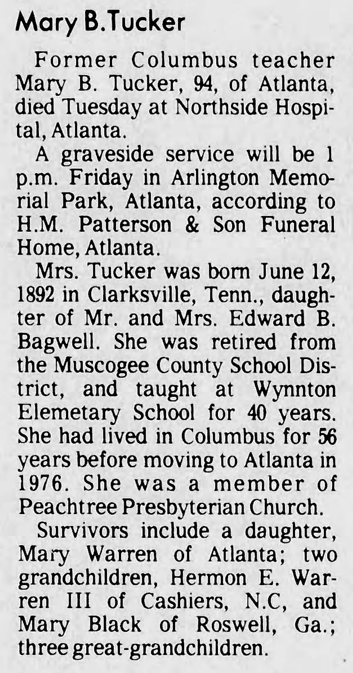 Mary Bagwell was born on 12 June 1892 in Montgomery County, Tennessee. She was the daughter of Edward Bentley Bagwell and Sarah Jane Lyle. As of after 1910,her married name was Tucker. Mary Bagwell married (?) Tucker after 1910. Mary Bagwell died on 23 December 1986 in Atlanta, Fulton County, Georgia, at age 94. She was buried at Arlington Memorial Park, Sandy Springs, Fulton County, Georgia.