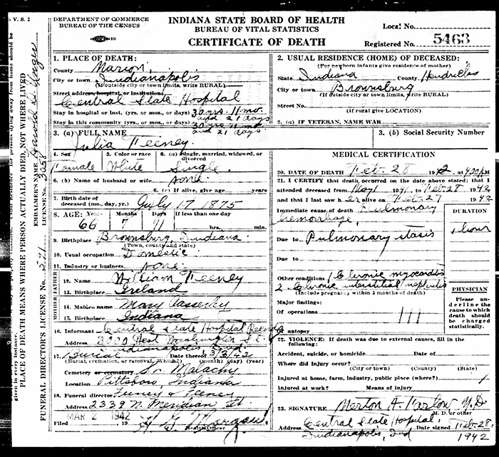 Julia Feeney was born on 17 July 1875 in Brownsburg, Indiana.1 She was the daughter of William Feeney and Mary Casserly.1 Julia Feeney died on 28 February 1942 in Central State Hospital, Indianapolis, Marion County, Indiana, at age 66. She was buried at Saint Malachy West Cemetery, Pittsboro, Hendricks County, Indiana.