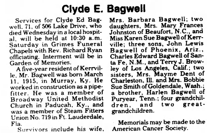 Services for Clyde Ed Bagwell. 71, of 506 Lake Drive, who died Wednesday in a local hospital, will be held at 10:30 a.m. Saturday in Grimes Funeral Chapels with Rev. Richard Ryan officiating. Interment will be in Garden of Memories. A five-year resident of Kerrville, Mr. Bagwell was born March 11, 1915, in Murray, Ky. He worked in construction as a pipe- fitter. He was a member of Broadway United Methodist Church in Paducah, Ky., and was a member of Steam Fitters Union No. 719 in Ft. Lauderdale, Fla. Survivors include his wife, Mrs. Barbara Bagwell, two daughters, Mrs. Mary Frances Johnston of Beaufort, N.C., and Miss Karen Sue Bagwell of Kerrville; three sons, John Lewis Bagwell of Phoenix, Ariz., Charles Edward Bagwell of Santa Fe, N.M., and Terry J. Browley of Los Angeles, Calif; two sisters, Mrs. Mayme Dent of Charleston, 111. and Mrs. Bobbie Sue Smith of Goldendale, Wash; a brother, Harlen Bagwell of Puryear, Tenn; four grandchildren, and two great- grandchildren.