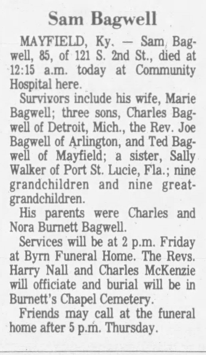 Samuel Burnett Bagwell was born on 12 June 1903 in Graves County, Kentucky. He was the son of Charles Archer Bagwell and Nora Hilda Burnett. Samuel Burnett Bagwell married Marine Chester circa 1927 at Mayfield, Graves County, Kentucky. Samuel Burnett Bagwell died on 17 May 1989 in Mayfield, Graves County, Kentucky, at age 85. He was buried at Burnett Chapel Cemetery, Graves County, Kentucky.