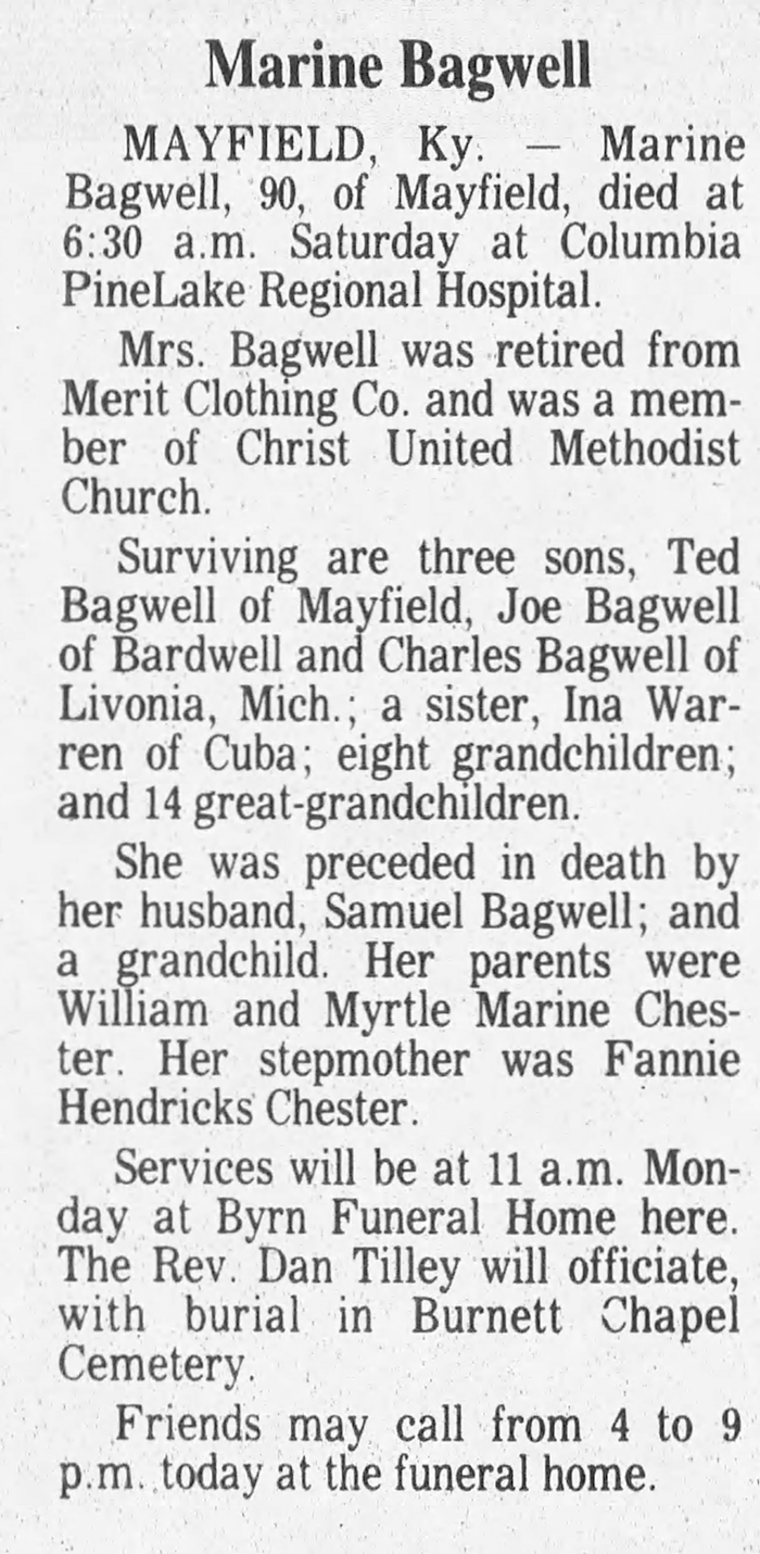 Marine Chester was born on 28 November 1907 in Kentucky. She married Samuel Burnett Bagwell, son of Charles Archer Bagwell and Nora Hilda Burnett, circa 1927 at Mayfield, Graves County, Kentucky. Marine Chester died on 14 February 1998 in Mayfield, Graves County, Kentucky, at age 90. She was buried on 15 February 1998 at Burnett Chapel Cemetery, Paducah, Kentucky.