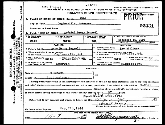 Arby Clifford Bagwell was born on 14 November 1908 in Arkansas.1 He was the son of Arzro Berry Bagwell and Luvina V. "Liew" Williams. Arby Clifford Bagwell married Callie Irene James on 15 December 1928 at NcClain County, Oklahoma. Arby Clifford Bagwell died on 1 June 1985 in Oklahoma City, Oklahoma County, Oklahoma, at age 76.1 He was buried at Cook Cemetery, McClain County, Oklahoma.1