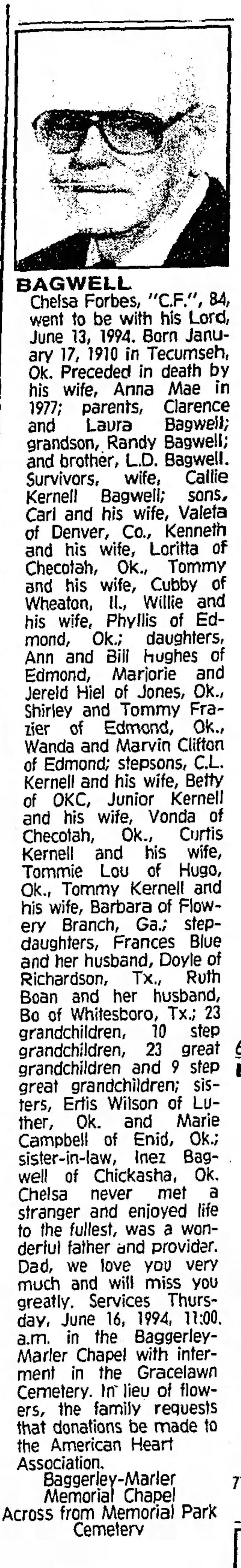 Chelsa Forbes Bagwell was born on 17 January 1910 in Tecumseh, Oklahoma.1 He was the son of Clarence Elbert Bagwell and Lura Bowen. Chelsa Forbes Bagwell married Oleta Inez Denney on 6 June 1931 at Custer County, Oklahoma. Chelsa Forbes Bagwell and Oleta Inez Denney were divorced on 8 May 1937 at Oklahoma County, Oklahoma; Another source hass the date of divorce as October 15, 1936. Chelsa Forbes Bagwell married Anna Mae Wilford on 8 October 1938.2 Chelsa Forbes Bagwell married Callie B. Worthy after 1977 at Oklahoma. Chelsa Forbes Bagwell died on 13 June 1994 in Oklahoma City, Oklahoma County, Oklahoma, at age 84.1 He was buried on 16 June 1994 at Gracelawn Cemetery, Edmond, Oklahoma County, Oklahoma.1