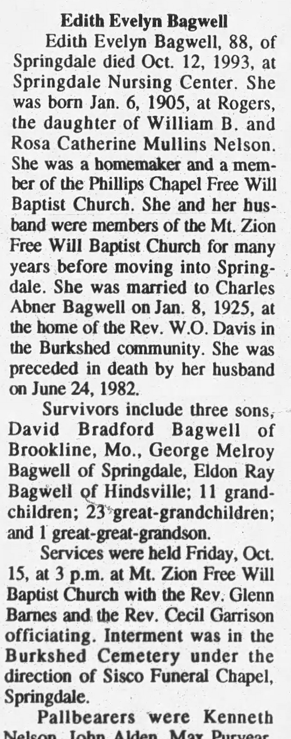 Edith Evelyn Nelson was born on 6 January 1905 in Rogers, Benton County, Arkansas.1 As of 8 January 1925,her married name was Bagwell. She married Charles Abner Bagwell, son of Thomas Coffey Bagwell and Sophiah Elizabeth Hawkins, on 8 January 1925 at Burkshed Community, Arkansas. Edith Evelyn Nelson died on 12 October 1993 in Springdale, Washington County, Arkansas, at age 88.1 She was buried at Burkshed Cemetery, Washington County, Arkansas.1