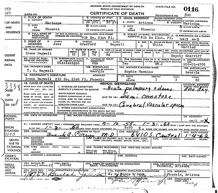 Jesse Bradford Bagwell was born on 28 December 1876 in Spring Valley, Washington County, Arkansas.1 He was the son of Thomas Coffey Bagwell and Sophiah Elizabeth Hawkins. Jesse Bradford Bagwell married Georgia Lee Looney on 14 July 1898 at Eufaula, Mcintosh County, Oklahoma. Jesse Bradford Bagwell married Arvilla Irene Hemphill before 1950. Jesse Bradford Bagwell died on 3 January 1962 in Phoenix, Arizona, at age 85.1 He was buried on 8 January 1962 at Resthaven Park East Cemetery, Phoenix, Maricopa County, Arizona.1