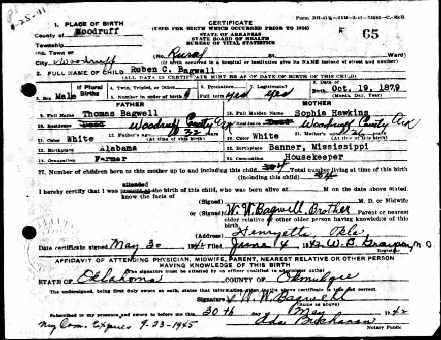 - Ruben Carl Bagwell+ b. 19 Oct 1879, d. 4 May 1947
