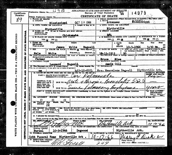 James Wiley Bagwell was also known as James Wylie Bagwell. James Wiley Bagwell was also known as Bill Bagwell. He was born on 15 October 1915 in Bruce, Calhoun County, Mississippi. He was the son of Leonard Okney Bagwell and Annie Lee Gill. James Wiley Bagwell married Francis Mauvalene Long before 1935. James Wiley Bagwell died on 3 October 1966 in Blytheville, Mississippi County, Arkansas, at age 50. He was buried on 5 October 1966 at Dogwood Cemetery, Blytheville, Mississippi County, Arkansas.