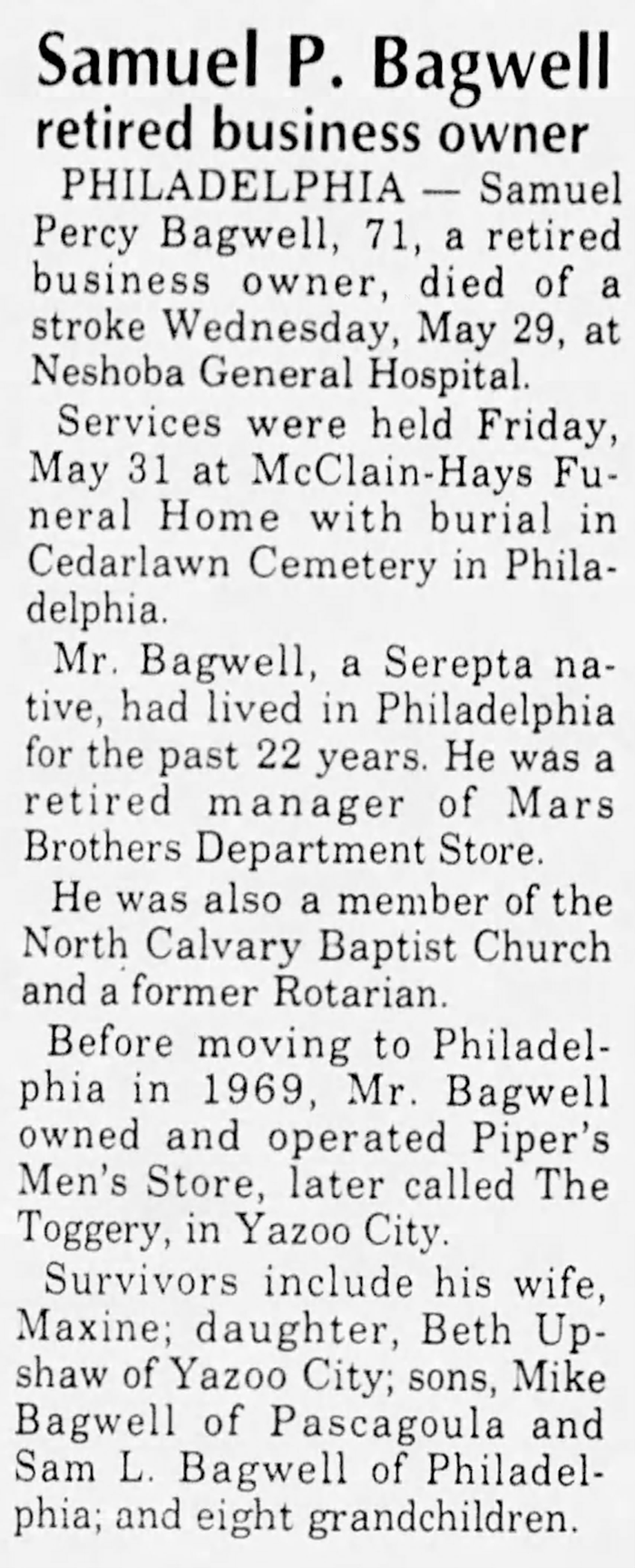 Samuel Percy Bagwell was born on 17 July 1919 in Serepta, Calhoun County, Mississippi. He was the son of Leonard Okney Bagwell and Annie Lee Gill. Samuel Percy Bagwell married Hilda Maxine Williams after 1937. Samuel Percy Bagwell died on 29 May 1991 in Neshoba General Hospital, Philadelphia, Neshoba County, Mississippi, at age 71. He was buried on 31 May 1991 at Cedarlawn Cemetery, Philadelphia, Neshoba County, Mississippi.