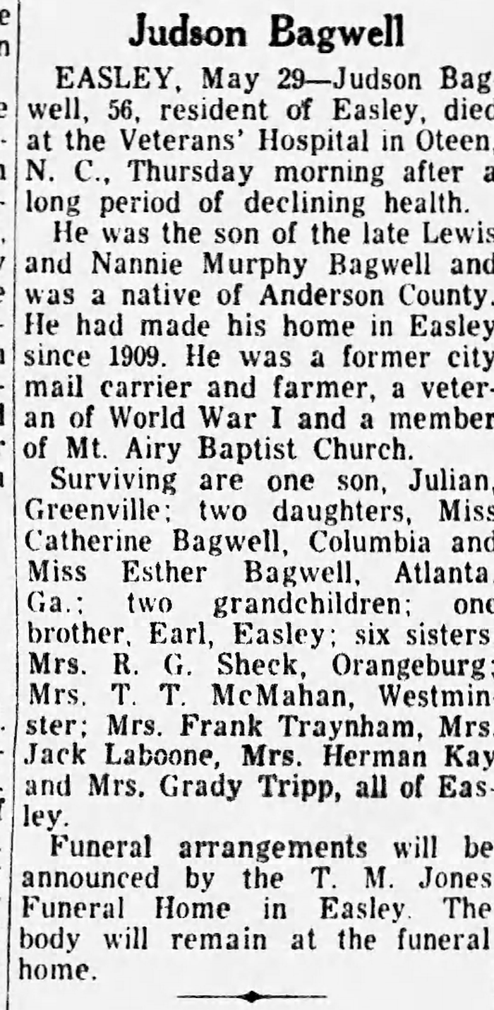 J. Judson Bagwell was also known as Judson Bagwell. He was born on 26 April 1896 in Easley, Pickens County, South Carolina.1,2 He was the son of William Lewis Bagwell and Nancy ("Nannie") Murphy.1 He served as a Private in the 118th Field Artillery, 31st Division, United States Army during World War I.2 J. Judson Bagwell married Ella Mae McClung on 5 October 1917 at Bibb County, Georgia. J. Judson Bagwell died on 29 May 1952 in Verteran's Hospital, Oteen, North Carolina, at age 56.1,2 He was buried at Mount Airy Baptist Church Cemetery, Anderson County, South Carolina.2