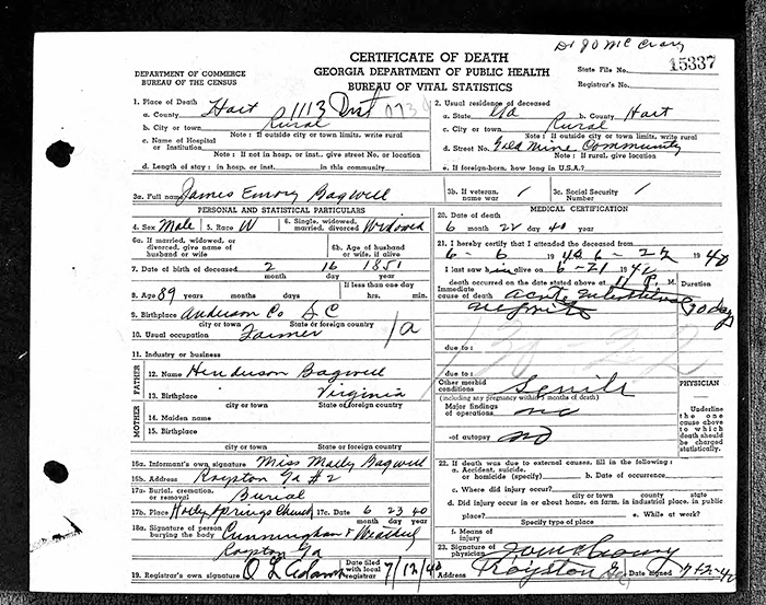 - [S7227] James Emory Bagwell, Certificate of Death - Georgia: James Emory Bagwell.
