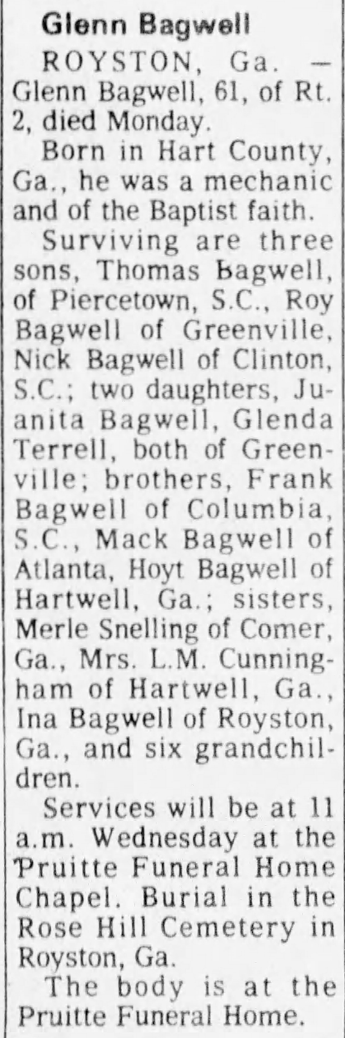 Glenn Howard Bagwell was also known as Howard Glenn Bagwell. He was born on 11 May 1915 in Hart County, Georgia.1 He was the son of James Callie Bagwell and Bertie Eva Pruitt. Glenn Howard Bagwell married Reba Pauline Welborn before 1935. Glenn Howard Bagwell married Virgie Christine McAlister on 28 January 1952 at Hartwell, Georgia. Glenn Howard Bagwell died on 18 April 1977 in Hartwell, Hart County, Georgia, at age 61.1 He was buried on 20 April 1977 at Rose Hill Cemetery, Royston, Franklin County, Georgia.1