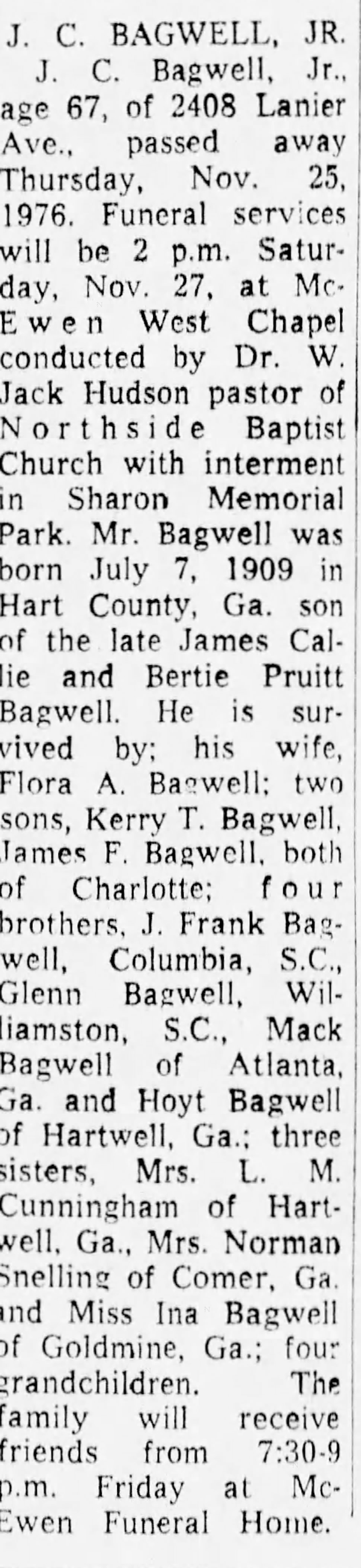 James Callie Bagwell Jr. was born on 7 July 1909 in Hart County, Georgia.1 He was the son of James Callie Bagwell and Bertie Eva Pruitt. James Callie Bagwell Jr. married Flora Ayers after 1928. James Callie Bagwell Jr. died on 25 November 1976 in Charlotte, Mecklenburg County, North Carolina, at age 67.1 He was buried on 27 November 1976 at Sharon Memorial Park, Charlotte, Mecklenburg County, North Carolina.1