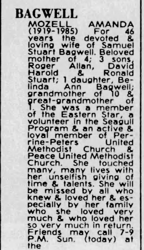 Mozelle Amanda Luper was born on 13 November 1919 in Fries, Grayson County, Virginia.1 As of after 1930,her married name was Bagwell.1 She married Samuel Stuart Bagwell, son of Winfield Calloway Bagwell and Martha Emma Luper, on 21 December 1938.1,2 Mozelle Amanda Luper died on 29 June 1985 in Miami, Miami-Dade County, Florida, at age 65. She was buried at Woodlawn Park Cemetery South, Miami, Miami-Dade County, Florida.