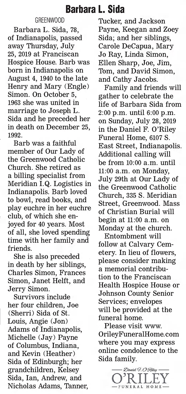 Barbara Louise Simon was born on 4 August 1940 in Indianapolis, Marion County, Indiana. She was the daughter of Henry Joseph Simon and Mary Mildred Engle. As of 5 October 1963,her married name was Sida. Barbara Louise Simon married Joseph Leo Sida on 5 October 1963 at Indianapolis, Marion County, Indiana. Barbara Louise Simon died on 25 July 2019 in Indianapolis, Marion County, Indiana, at age 78. She was buried on 29 July 2019 at Calvary Cemetery, Indianapolis, Marion County, Indiana.