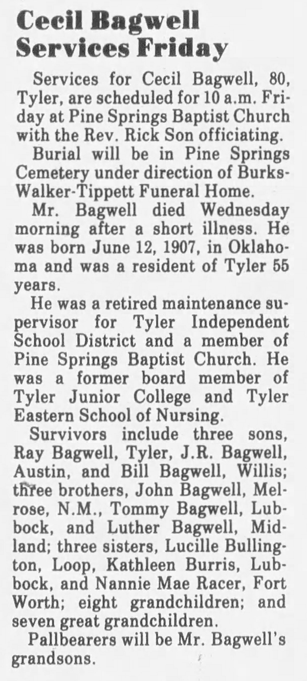 - Cecil Ray Bagwell+2 b. 4 Dec 1929, d. 8 Aug 1996