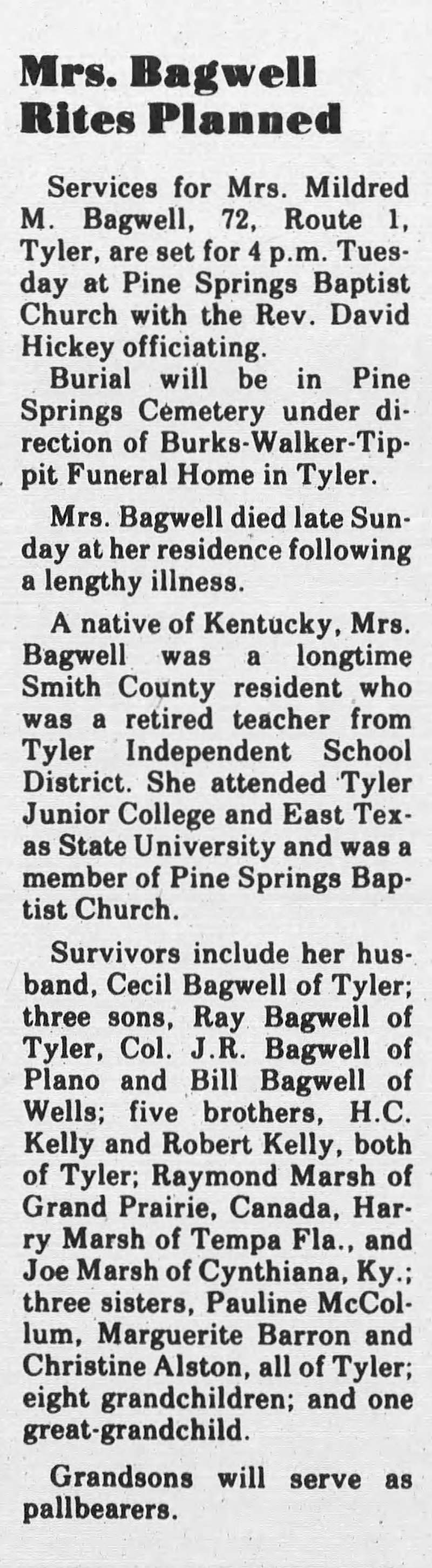 James Cecil Bagwell was born on 12 June 1907 in Oklahoma City, Oklahoma County, Oklahoma.1 He was the son of James William Bagwell and Nancy Catherine Owens. James Cecil Bagwell married Mildred Irene Marsh on 2 July 1929 at Bryan County, Oklahoma.2 James Cecil Bagwell died on 29 July 1987 in Tyler, Smith County, Texas, at age 80.1 He was buried at Pine Springs Cemetery, Tyler, Smith County, Texas.1