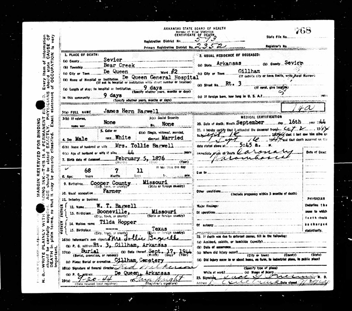 James Hearne Bagwell was also known as James Hern Bagwell. He was born on 5 February 1876 in Cooper County, Missouri.2 He was the son of Warden T. Bagwell and Rilda Hooper. James Hearne Bagwell married Ethel Girtrude Pennington before 1909. James Hearne Bagwell and Ethel Girtrude Pennington lived circa 1917 in Billings, Noble County, Oklahoma. James Hearne Bagwell and Ethel Girtrude Pennington lived in 1920. James Hearne Bagwell married Tollie M. Whitley before 1930. James Hearne Bagwell died on 16 September 1944 in Sevier County, Arkansas, at age 68.2 He was buried at Gillham Cemetery, Gillham, Sevier County, Arkansas; Obituary from The De Queen Bee, De Queen, Arkansas, 21 Sep 1944: