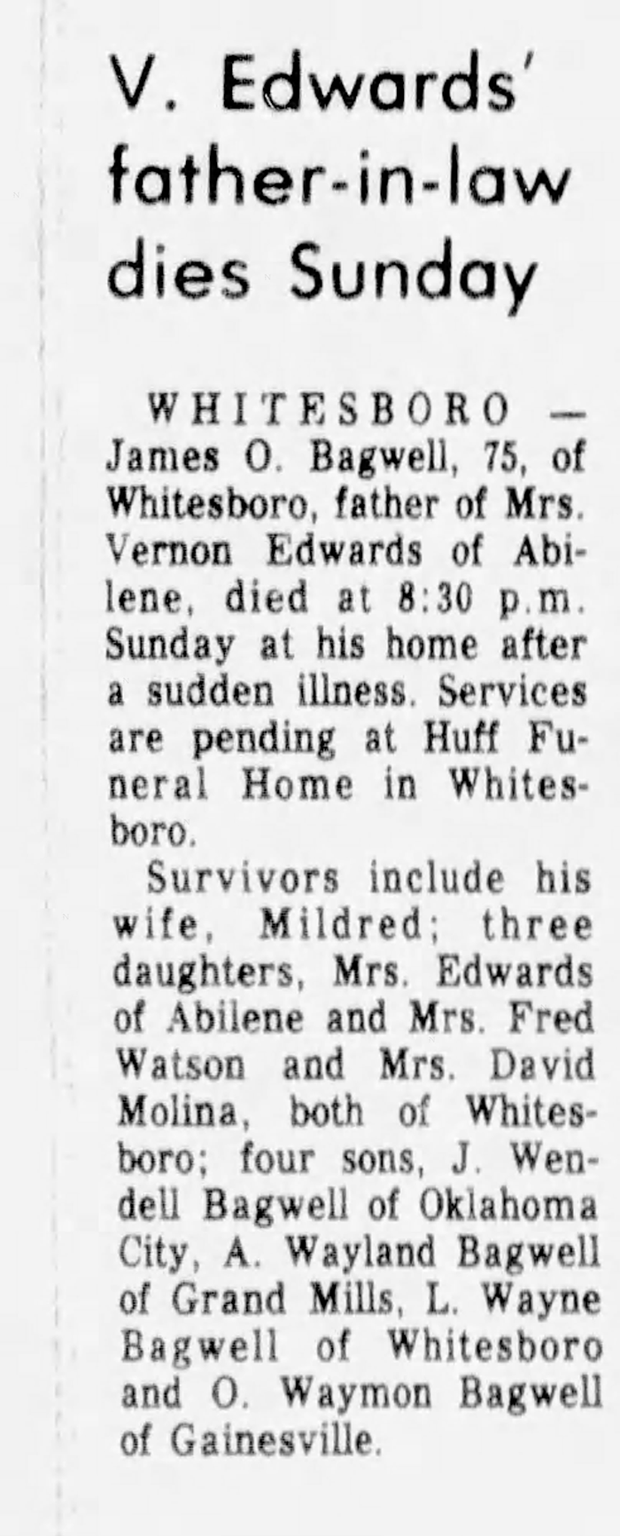 Survivors include his son and daughter-in-law, Jim and Annette Bagwell of Cedar Park; daughter and son-in-law, Judy and Don Thompson of Novato, Calif; grandchildren, Shari Bagwell, Jerod and Andrea Morris, Ed and Shannon Thompson, Bev and Kenneth Bodisch and Christian and David Roth and great-grandchildren, Brittan Morris, Brianna and Cassidy Bodisch and Isabella and Lucas Roth.