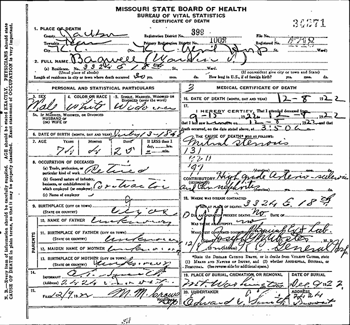 Warden T. Bagwell was also known as Ward Bagwell. He was born on 13 July 1848 in Booneville, Missouri. He was the son of Samuel W. Bagwell and Mary E. Johnson. Warden T. Bagwell married Rilda Hooper before 1876. Warden T. Bagwell lived in 1905 in Kansas City, Missouri. He died on 8 December 1922 in Jackson County, Missouri, at age 74. He was buried on 9 December 1922 at Mount Washington Cemetery, Independence, Jackson County, Missouri.