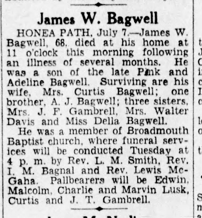 James Ware Bagwell was born on 29 May 1873 in Anderson, Anderson County, South Carolina.1 He was the son of William Pinkney Bagwell and Margaret Adeline Bagwell. James Ware Bagwell married Anna L. Lollis, daughter of George Washington Lollis and Louisa Bagwell, in 1901. James Ware Bagwell married Ella Curtis Lusk after 1904.2 James Ware Bagwell died on 7 July 1941 in Anderson, Anderson County, South Carolina, at age 68.1 He was buried on 8 July 1941 at Broadmouth Church Cemetery, Honea Path, Abbeville County, South Carolina.1