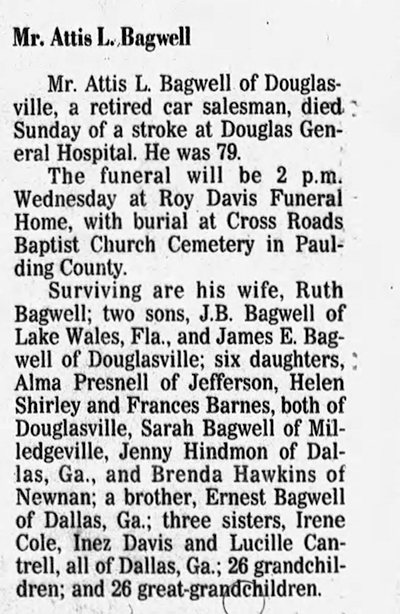 Attis Lee Bagwell was born on 23 July 1909 in Paulding County, Georgia.1 He was the son of Bryant Bruce Bagwell and Adalee Hunt. Attis Lee Bagwell married Ruby Lee Griffith on 26 December 1929 at Paulding County, Georgia. Attis Lee Bagwell died on 30 April 1989 in Georgia at age 79.1 He was buried at Crossroads Baptist Church Cemetery, Dallas, Paulding County, Georgia.1
