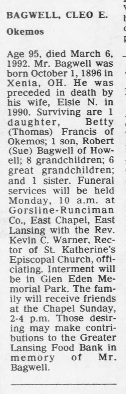 Cleo E. Bagwell was born on 1 October 1896 in Xenia, Greene County, Ohio.1 He was the son of Reverend Elihu Burton Bagwell and Mary Elizabeth Niswonger.1 He enlisted in the US Army 29 August 1918 in Cleo E. Bagwell. He was assigned to 5 Co 2 Training Battalion 159 Depot Brigade to 10 Sept 1918; Medical Department Base Hospital Cp Taylor to 26 Oct 1918; Medical Department Cp Sanitary Detachment West Point Ky to Discharge Private, first class 2 Apr 1919. Honorable discharge 12 Aug 1919. He married Elsie May Neher on 14 June 1925. Cleo E. Bagwell and Elsie May Neher lived in 1930 in Detroit, Wayne County, Michigan. Cleo E. Bagwell died on 6 March 1992 in East Lansing, Ingham County, Michigan, at age 95.