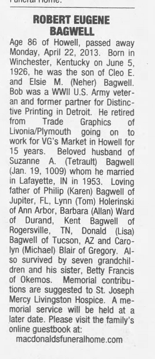 Robert, 86, of Howell, passed away Monday, April 22, 2013. He was the son of Cleo E. and Elsie M. (Neher) Bagwell.