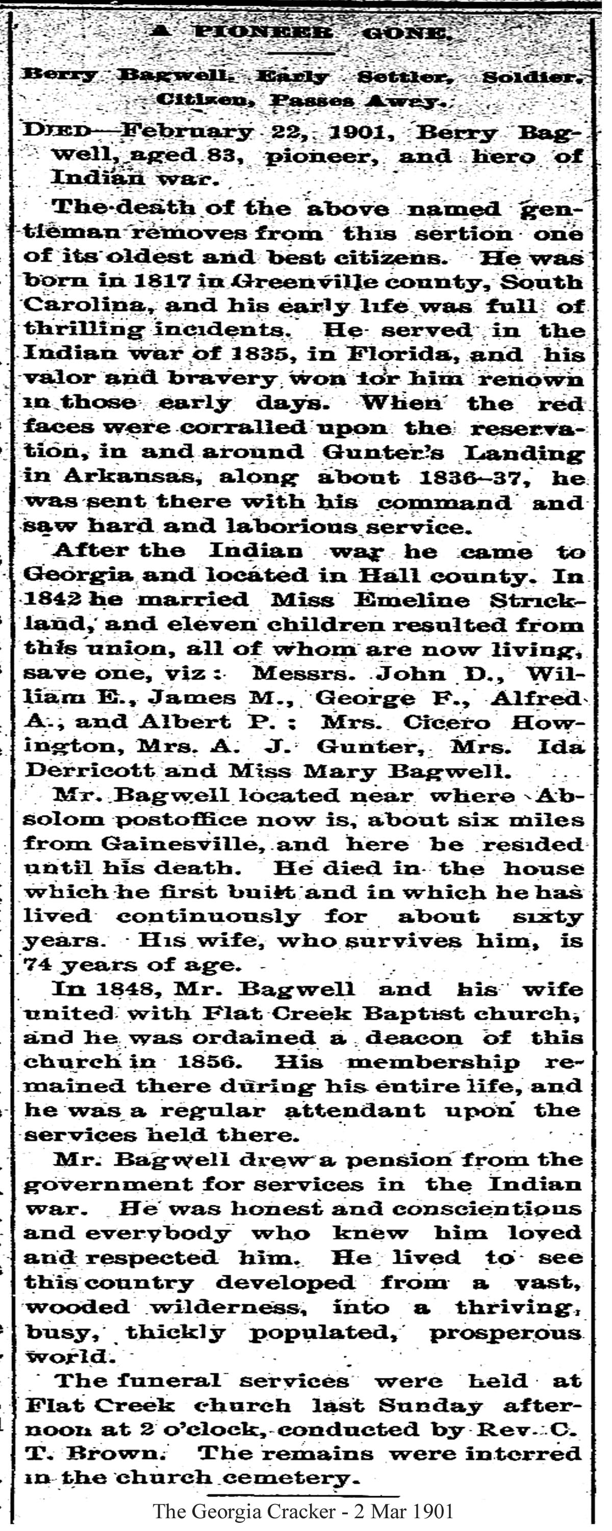 Fought on 20 Apr 1865 at Macon, GA.11 He lived in 1880 in Hall County, Georgia.3 He died on 21 January 1907 at age 76 'M' Bagwell. Date given on tombstone. Other Bagwells burried here include Berry and family (1817-1901),Delaney.12 He was buried at Flat Creek Baptist Church, Gainesville, Hall County, Georgia.6,12