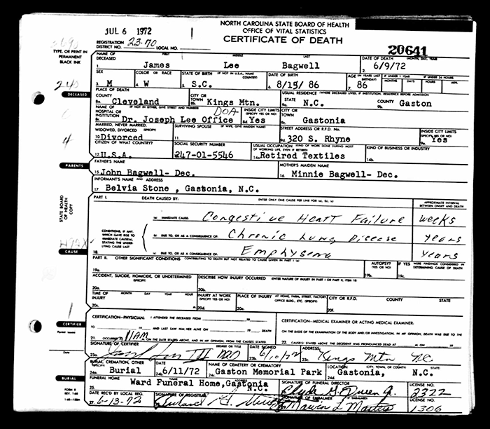 James Lee Bagwell was also known as Lee Bagwell. He was born on 15 August 1887 in Pelham, South Carolina. He was the son of Willis Marion Bagwell and Minnie Jones. James Lee Bagwell married Arminnie Isabella Cantrell before 1902. He served as a Private in the US Army during World War One. James Lee Bagwell married Mary Ellen Norwood on 16 September 1919 at Greenville County, South Carolina. James Lee Bagwell married Laura Robertson, daughter of John R. Jones, before 1940. James Lee Bagwell and Laura Robertson were divorced on 14 January 1963 at Gaston County, North Carolina. James Lee Bagwell died on 9 June 1972 in King's Mountain, Cleveland County, North Carolina, at age 84. He was buried on 11 June 1972 at Gaston Memorial Park, Gastonia, Gaston County, North Carolina.