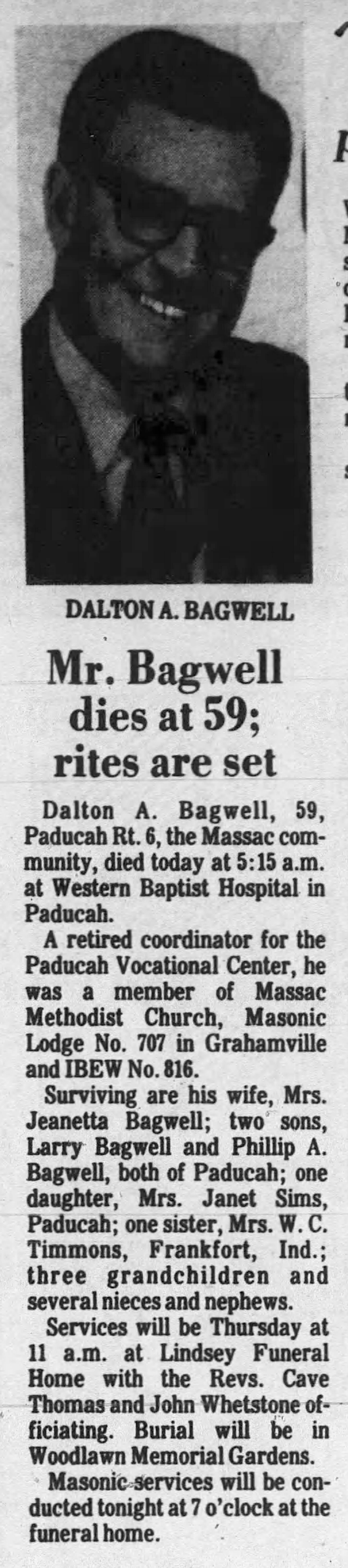 Dalton Andrew Bagwell died on 14 March 1978 in Western Baptist Hospital, Paducah, Kentucky, at age 59.1 He was buried on 16 March 1978 at Woodlawn Memorial Gardens, Paducah, McCracken County, Kentucky.1