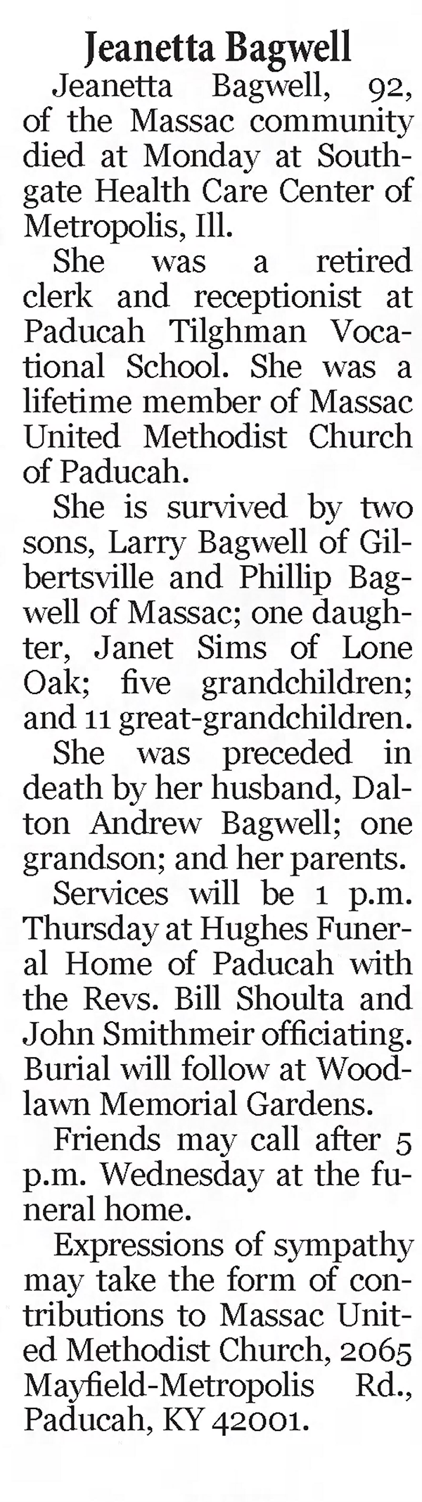 Jeanetta Bagwell ,92, of the Massac Community died at 8:15 a.m. Monday, February 13, 2012 at Southgate Health Care Center in Metropolis, IL.