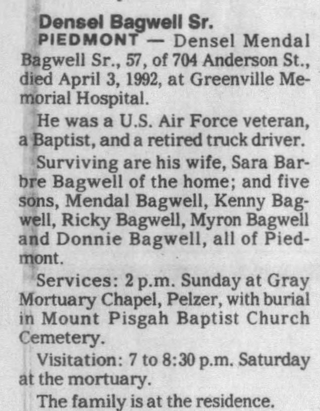 Densel Mendel Bagwell was born on 12 September 1934 in Anderson County, South Carolina.1 He was the son of Wilton Mendel Bagwell and Alma Louise Elrod. He served in the US Air Force (A1C) during the Korean War. Densel Mendel Bagwell married Sara Louise Barbre before 1959. Densel Mendel Bagwell died on 3 April 1992 in Greenville Memorial Hospital, Greenville, Greenville County, South Carolina, at age 57.1 He was buried at Mount Pisgah Baptist Church Cemetery, Anderson County, South Carolina.1