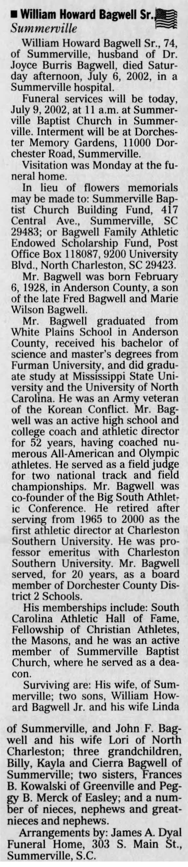 She was preceded in death by her parents, Fred and Marie Bagwell, brother, Howard Bagwell, of Summerville.1 She was buried at Mount Pisgah Baptist Church Cemetery, Anderson County, South Carolina.1