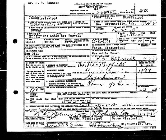 Annie Lee Gill was born on 21 December 1891 in Paris, Mississippi. As of circa 1910,her married name was Bagwell. She married Leonard Okney Bagwell, son of James Wiley Bagwell and Annie Eliza Davis, circa 1910. Annie Lee Gill died on 13 January 1952 in Blytheville, Mississippi County, Arkansas, at age 60. She was buried at Mount Moriah Cemetery, Bruce, Calhoun County, Mississippi.