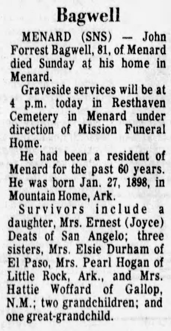 John Forrest Bagwell was born on 27 January 1898 in Mountain Home, Baxter County, Arkansas.1 He was the son of Allen H. Bagwell Jr. and Mary Elizabeth Bolding.1 John Forrest Bagwell lived in 1920 in Concho County, Texas. He married Bertha Lee Roberts before 1924.1 John Forrest Bagwell died on 14 January 1979 in Menard County, Texas, at age 80 of a severe head injury when he fell outside the home during freezing weather conditions.1 He was buried on 16 January 1979 at Rest Haven Cemetery, Menard, Menard County, Texas.