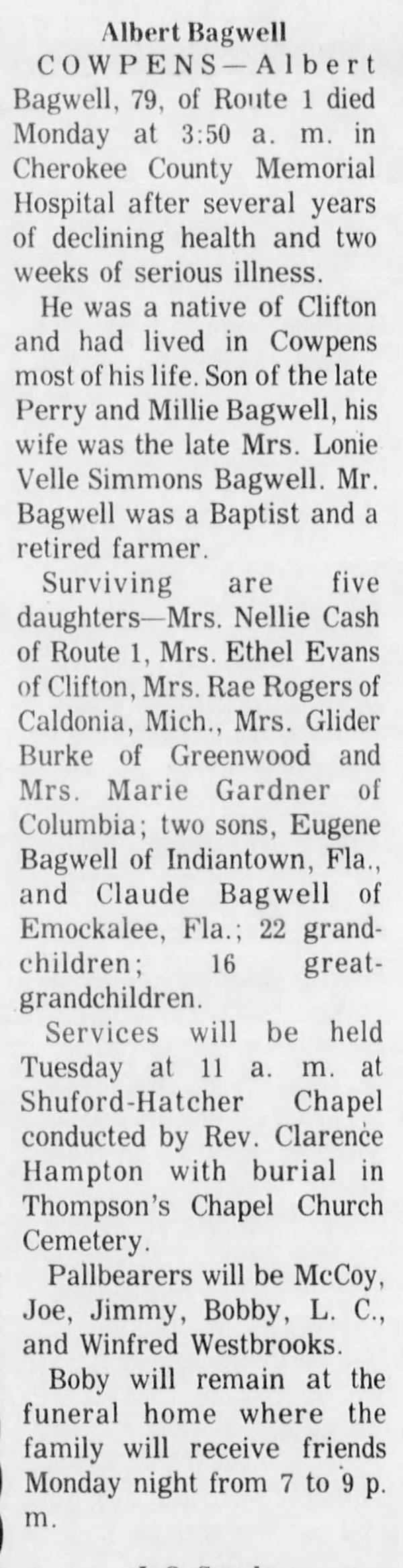 Albert Bagwell was born on 8 February 1894 in South Carolina.1 He was the son of Perry T. Bagwell and Millie Thornton. Albert Bagwell married Lonie Velle Simmons after 1915.2 Albert Bagwell died on 6 August 1973 in Gaffney, Cherokee County, South Carolina, at age 79.1 He was buried at Thompson Chapel Cemetery, Spartanburg, Spartanburg County, South Carolina.1
