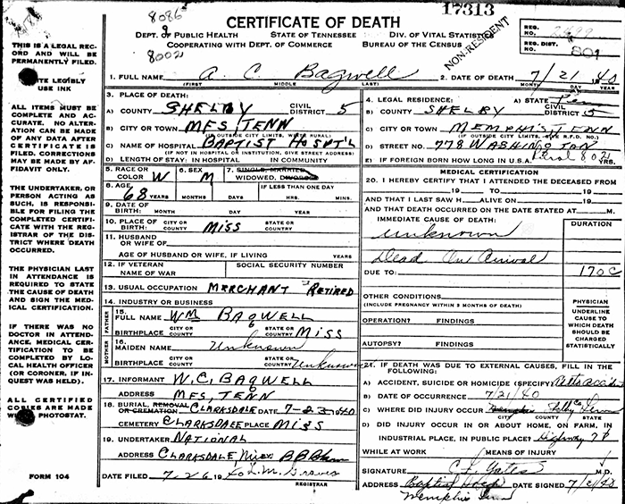 Alfred Clarence Bagwell was born in March 1871 in Mississippi. He was the son of William Crawford Bagwell and Lucinda (?) Alfred Clarence Bagwell married Emma C. Fewell on 4 March 1891. Alfred Clarence Bagwell died on 21 July 1940 in Memphis, Shelby County, Tennessee, at age 69 of an automobile accident in Memphis, Shelby County, Tennessee. He was pronounced dead on arrival at Baptist Hospital in Memphis, Shelby County, Tennessee. He was buried on 23 July 1940 at Clarksdale, Mississippi.