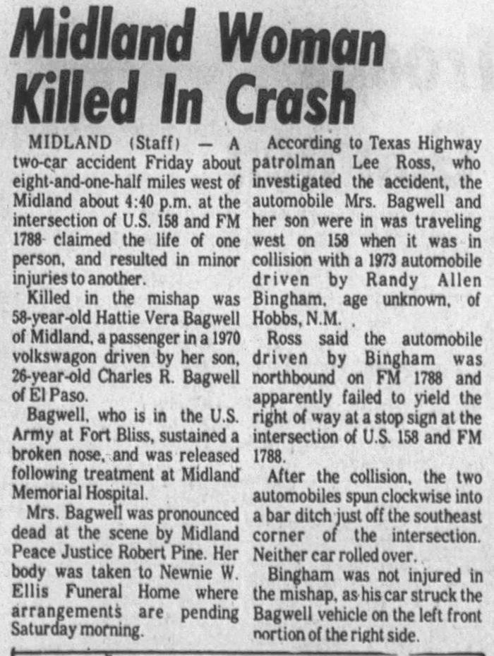 Hattie Vera Allbright was born on 25 April 1909 in Junction, Texas.1 As of 27 December 1926,her married name was Bagwell. She married Luther Josephus Bagwell, son of Larkin Madison Bagwell and Lavada Elnora Martin, on 27 December 1926. Hattie Vera Allbright died on 29 December 1972 in Midland, Texas, at age 63 of a two-car accident 8 1/2 miles west of Midland, Texas at the intersection of U.S. 158 and FM 1788.1 She was buried at Bradshaw Cemetery, Bradshaw, Taylor County, Texas.1