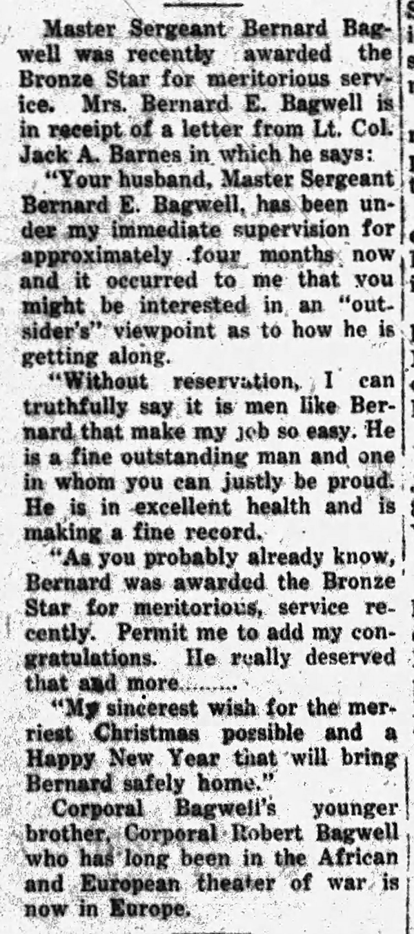 - Master Sergeant Bernard Emil Bagwell+ b. 19 Jul 1914, d. 31 May 2001