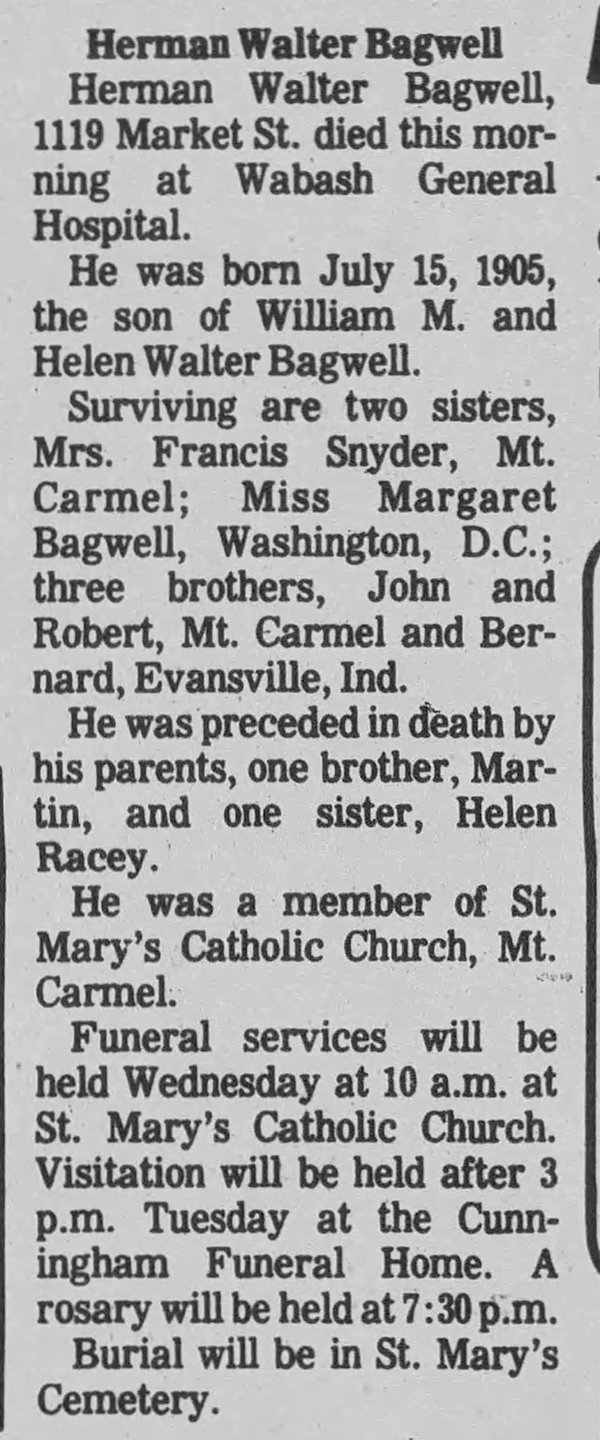 Herman Walter Bagwell was born on 15 July 1904 in Mount Carmel, Wabash County, Illinois. He was the son of William Monroe Bagwell and Mary Helen Walter. Herman Walter Bagwell died on 14 September 1981 in Wabash General Hospital, Mount Carmel, Wabash County, Illinois, at age 77. He was buried at Saint Mary's Cemetery, Mount Carmel, Wabash County, Illinois.