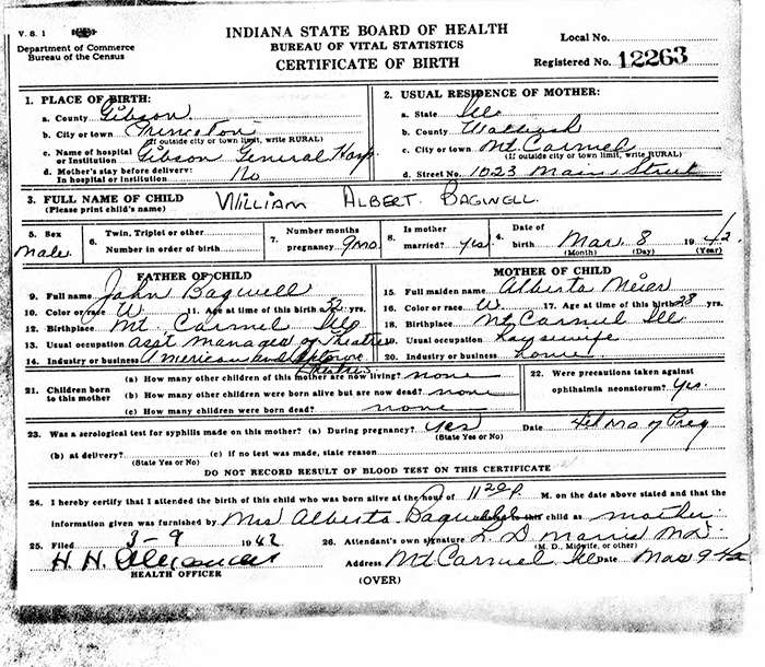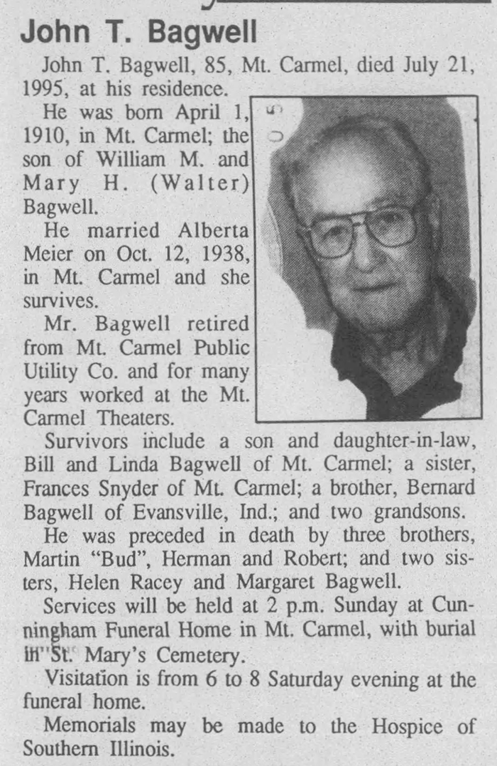 John Theodore Bagwell was born on 1 April 1910 in Mount Carmel, Wabash County, Illinois. He was the son of William Monroe Bagwell and Mary Helen Walter. John Theodore Bagwell married Alberta E. Meir on 12 October 1938 at Wabash County, Illinois. John Theodore Bagwell died on 21 July 1995 in Mount Carmel, Wabash County, Illinois, at age 85. He was buried on 23 July 1995 at Saint Mary's Cemetery, Mount Carmel, Wabash County, Illinois.