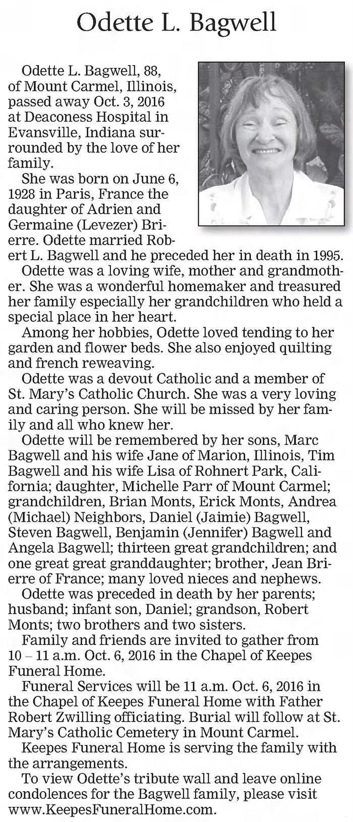 Odette L. Bagwell, 88, of Mount Carmel, IL passed away on Monday, October 3, 2016 at Deaconess Hospital in Evansville, IN surrounded by the love of her family. She was born on June 6, 1928 in Paris, France the daughter of Adrien and Germaine (Levezer) Brierre. Odette married Robert L. Bagwell and he preceded her in death in 1995.