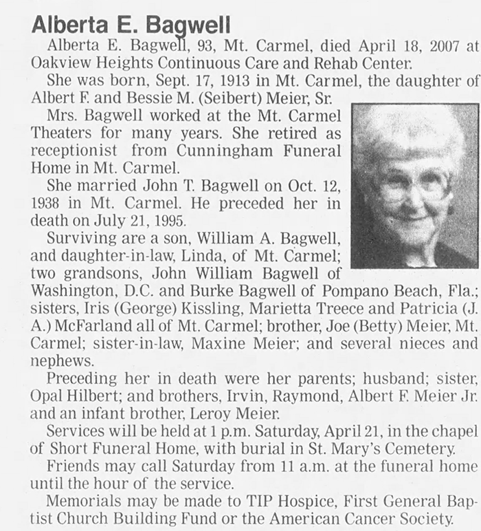 Alberta E. Meir was born on 17 September 1913 in Mount Carmel, Wabash County, Illinois. As of 12 October 1938,her married name was Bagwell. She married John Theodore Bagwell, son of William Monroe Bagwell and Mary Helen Walter, on 12 October 1938 at Wabash County, Illinois. Alberta E. Meir died on 18 April 2007 in Mount Carmel, Wabash County, Illinois, at age 93. She was buried at Saint Mary's Cemetery, Mount Carmel, Wabash County, Illinois.