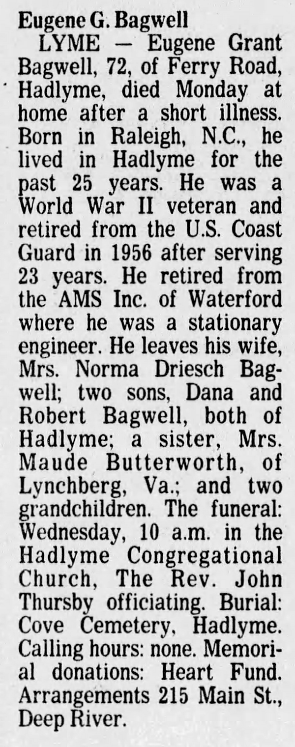 Eugene Grant Bagwell was born on 16 April 1904 in North Carolina.1 He was the son of Lonnie D. Bagwell and Martha D. Stevens. Eugene Grant Bagwell married Emma Virginia Hogart on 5 October 1926 at Norfolk, Virginia. Eugene Grant Bagwell married Norma Driesch on 24 September 1947 at East Haddam, Connecticut. He served in the United States Coast Guard from 2 November 1948 to 1 November 1951. Eugene Grant Bagwell died on 2 August 1976 at age 72.1 He was buried at Cove Cemetery, Hadlyme, New London County, Connecticut.1