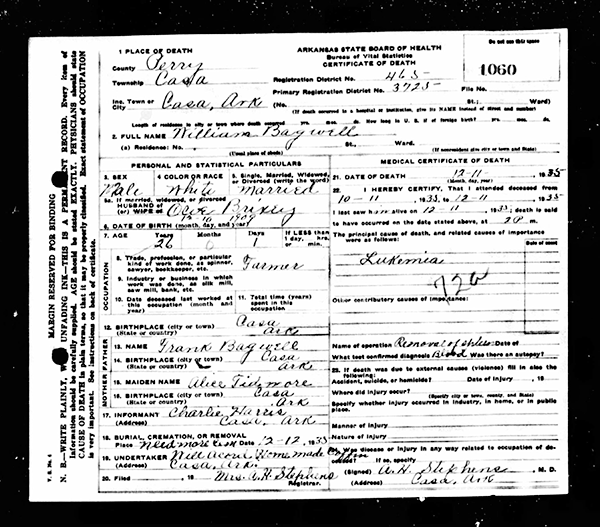 William Hansey Bagwell was born on 10 December 1909 in Arkansas.1 He was the son of Francis Asbury Bagwell and Alice Rebecca Tidmore.1 William Hansey Bagwell married AnnaVee Otha Brixey on 25 September 1931 at Yell County, Arkansas. William Hansey Bagwell died on 11 December 1935 in Casa, Arkansas, at age 26 of Leukemia.1 He was buried on 12 December 1935 at Needmore Cemetery, Casa, Yell County, Arkansas.1