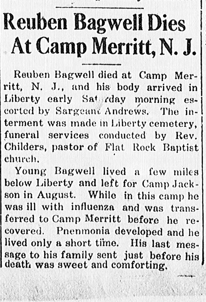 Reuben M. Hunter Bagwell was born on 28 March 1897 in South Carolina. He was the son of Noah Lewis Bagwell and Mary Elizabeth Hunter. He was in training for the US Army on 29 August 1918 at Camp Jackson, Pickens County, South Carolina. Reuben M. Hunter Bagwell died in November 1918 in Camp Merritt, New Jersey, at age 21 He was ill with influenza (Spanish Flu), recovered and then developed pnenmonia and died shortly after.