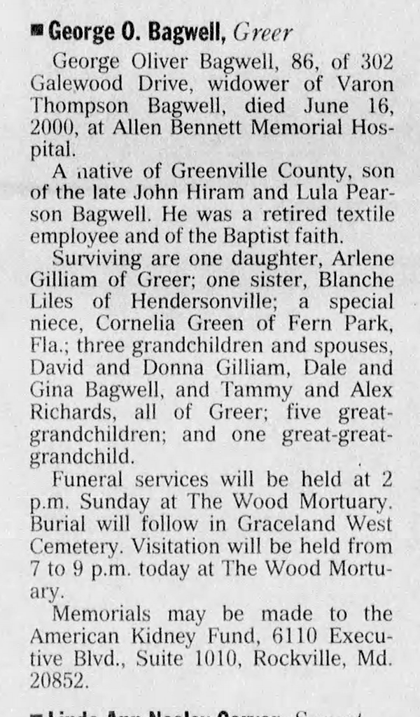 George Oliver Bagwell was born on 14 March 1914 in Greenville County, South Carolina.1 He was the son of John Hiram Bagwell and Lula May Pearson. George Oliver Bagwell married Varon Thompson after 1935. George Oliver Bagwell died on 16 June 2000 in Greer, Greenville County, South Carolina, at age 86.1 He was buried at Graceland West Cemetery and Mausoleum, Greenville, Greenville County, South Carolina.1