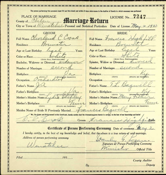 Marriage License for Nannie Frances (Bagwell) Cross and Charles Cleveland Cross