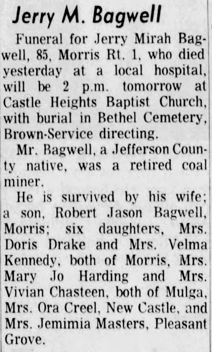 Jerry Mirah Bagwell was born on 25 December 1878 in Irondale, Jefferson County, Alabama. He was the son of John Lewis Bagwell and Mary Polly Bagwell. Jerry Mirah Bagwell married Nancy Ellen Self on 21 March 1909 at Indio, Jefferson County, Alabama. Jerry Mirah Bagwell died on 29 June 1964 in Morris, Jefferson County, Alabama, at age 85. He was buried at Bethel United Methodist Cemetery, Warrior, Jefferson County, Alabama.